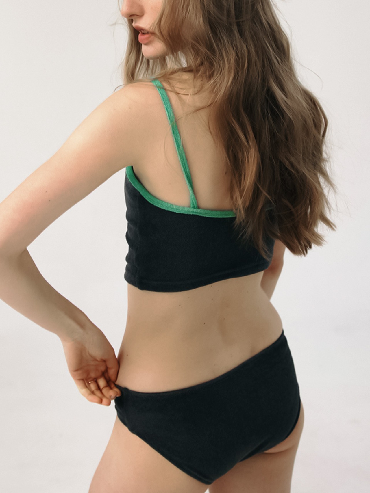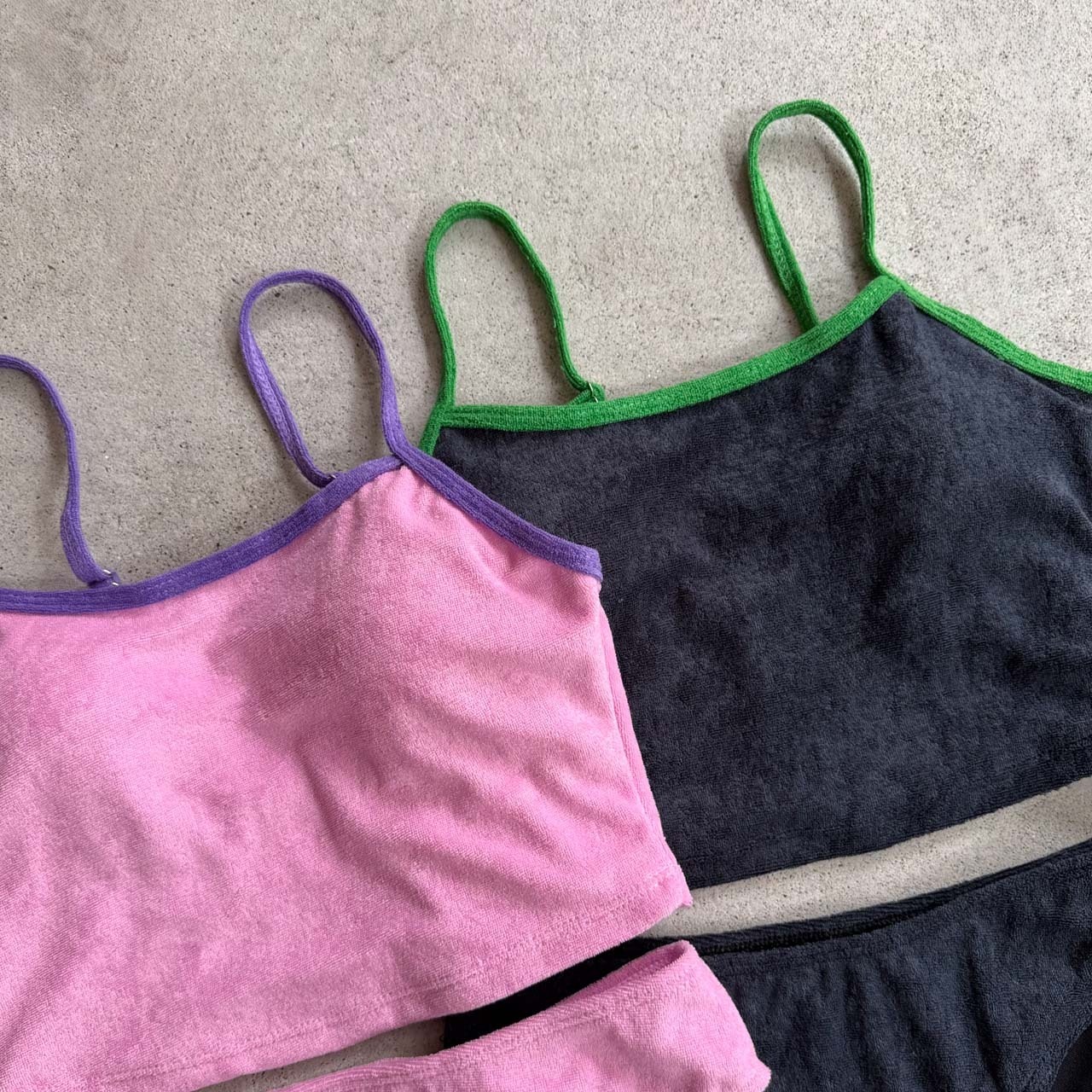 このビキニに使っているのは、“テリー素材(=パイル生地)”と呼ばれる、吸水性が高くて、どこか安心感のあるやさしい素材です。